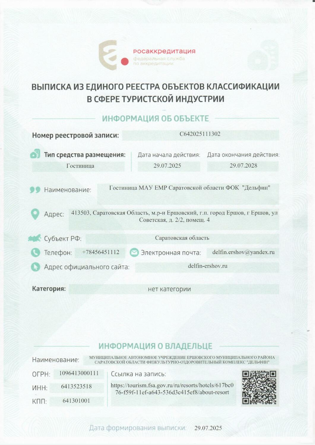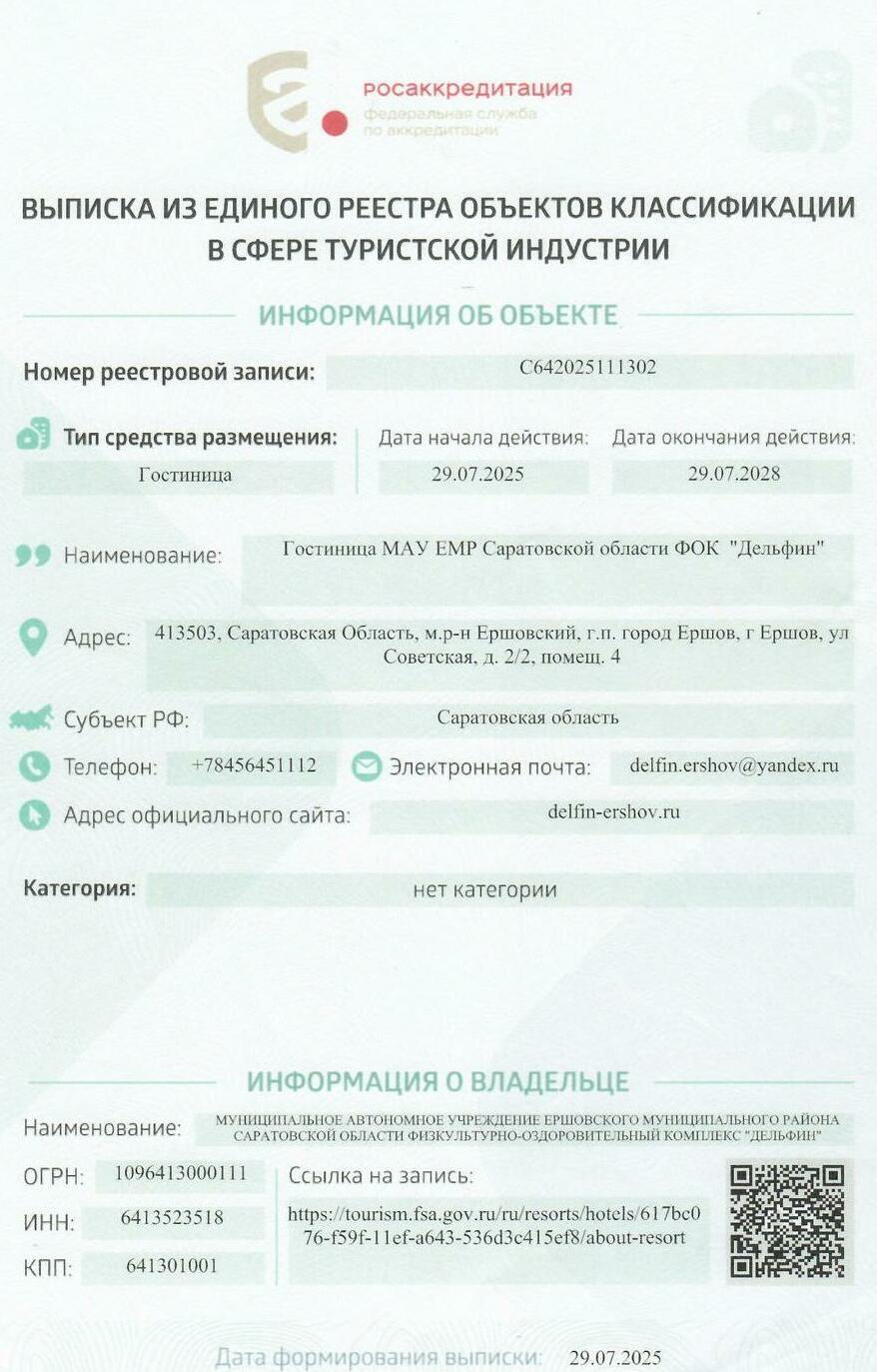 ГОСТИНИЦА ФОК "ДЕЛЬФИН" г. Ершова.